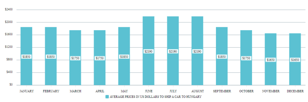 Will ocean freight rates go down to ship to Car to Hungary in 2025?, Yes the rates slowly began falling in the first quarter of 2025 and are expected to continue to drop, little by little. You calculate the ocean freight rate based on oil prices (BAF), dimensions of the vehicle, weight of the vehicle, port of export, port of destination, and season congestion. The following annual chart is showing the prices and costs for the year 2025 for average maritime freight for car shipping to Hungary.